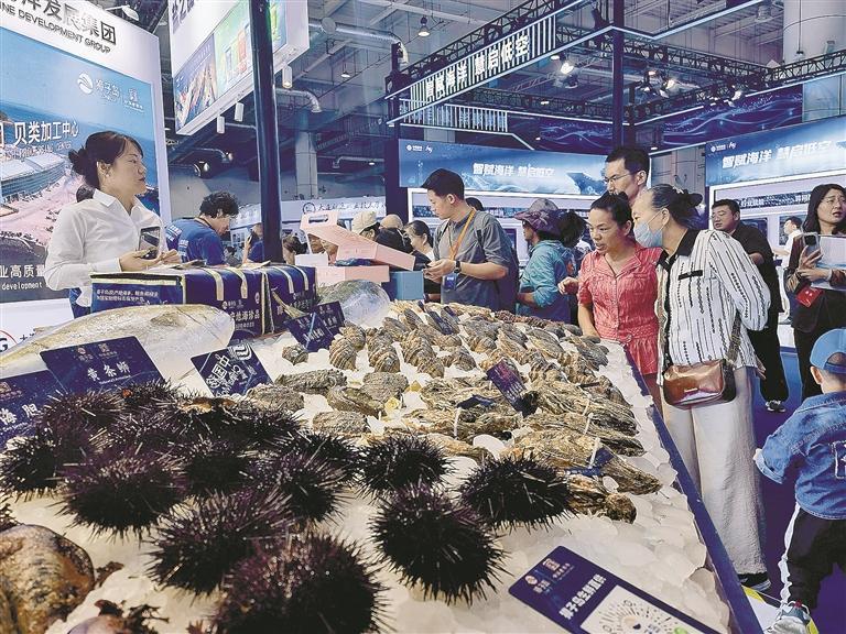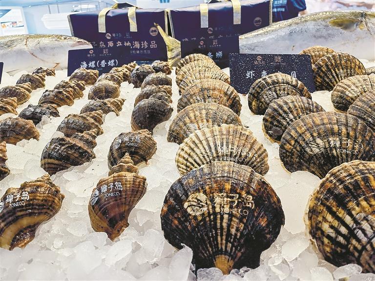 一斤左右一只的紫海胆、比巴掌还大的三倍体生蚝、超过20斤的黄条鰤……在第二届中国(大连)国际海洋商贸博览会上,试吃专区里即食海参、粉丝虾夷贝、生蚝、杂色蛤应有尽有,让参展者享受着来自北纬39°的天然馈赠。