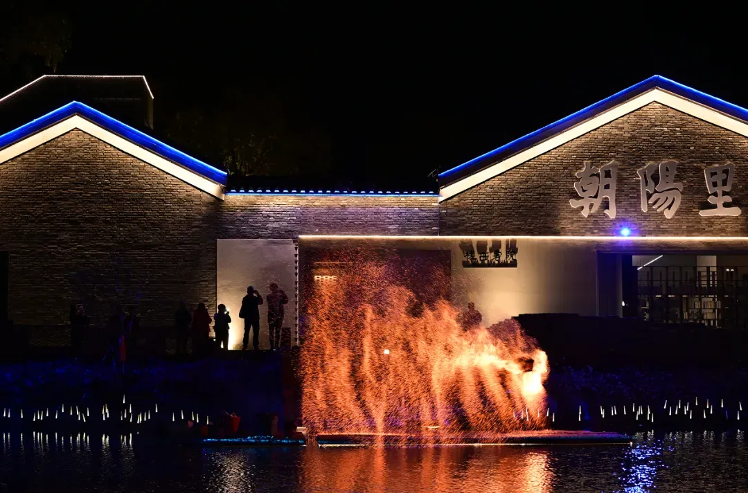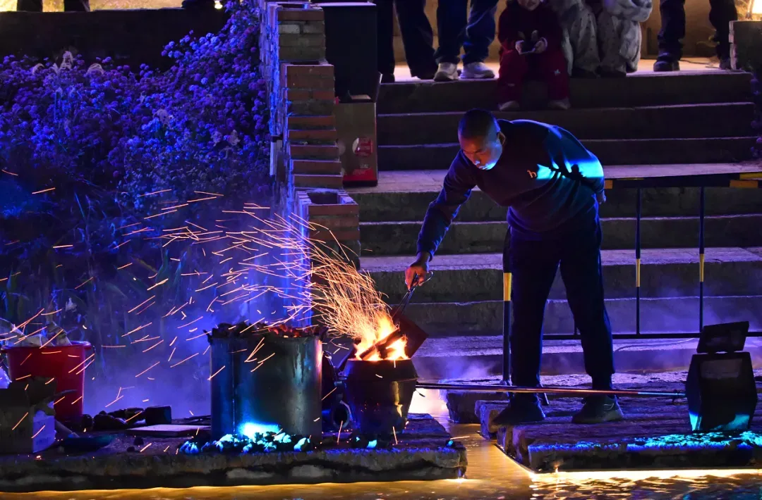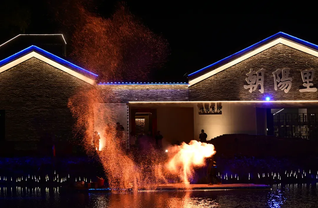 夜幕降临,最令人期待的非遗打铁花表演在槎西书院前震撼上演。传承人将千度铁水泼洒升空,铁水化作漫天星火,在水面上绽放出“火树银花不夜天”的盛景,引得现场游客阵阵惊呼,手机快门声此起彼伏,定格下这一震撼瞬间。